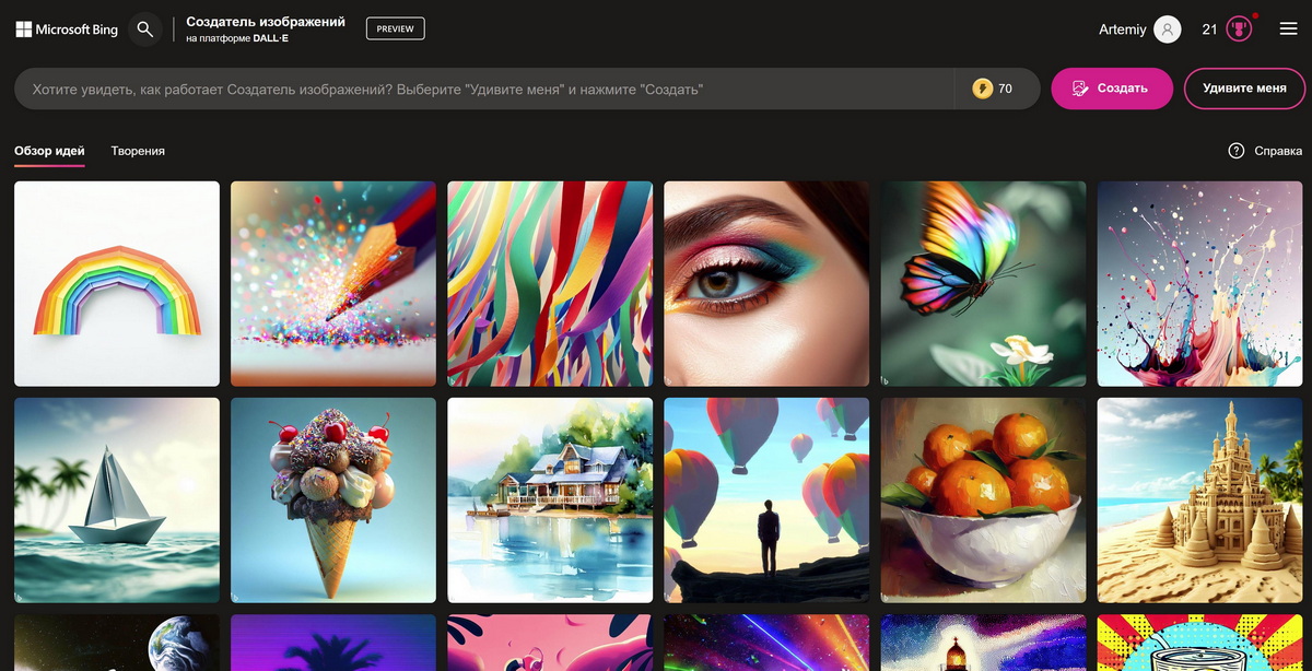Три главных элемента Microsoft Bing Image Creator – строка текстового описания для генерируемого изображения и две закладки: «Обзор идей», где собраны различные готовые картинки для вдохновения креаторов, и «Творения», нажав на которую, можно увидеть результаты совместного творчества человека и нейросети.