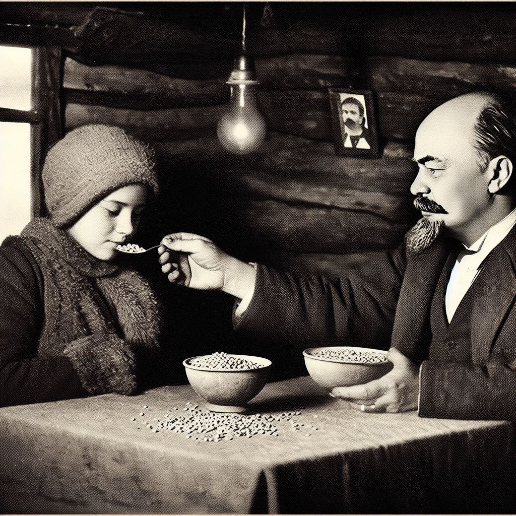 Но изображения с двумя известными личностями нейросеть все же нарисовала. Ими стали: Владимир Ленин, который по нашему запросу покормил детей крупой…