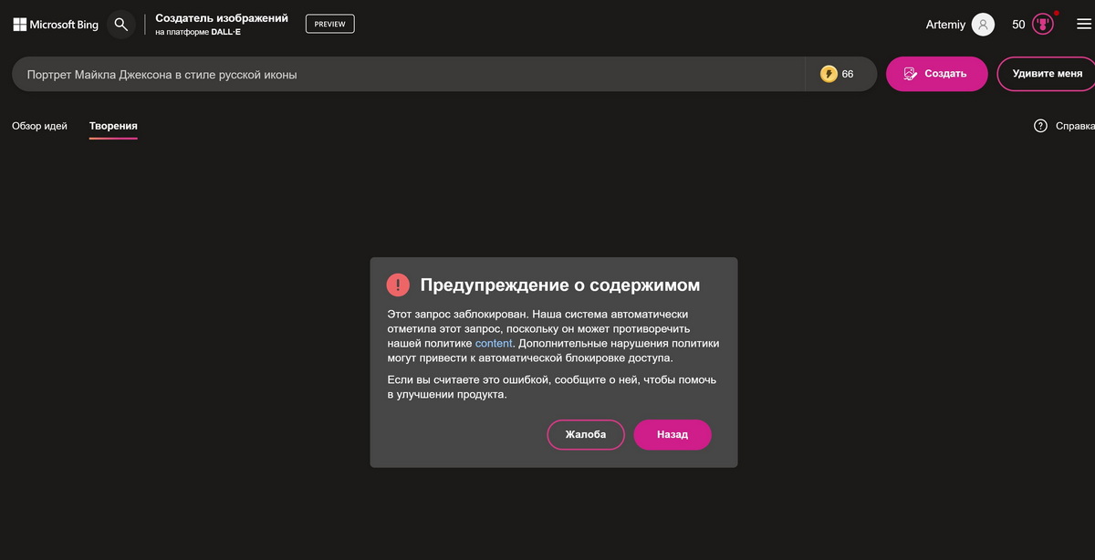 Приступаем к тестам. Сначала системе было предложено создать изображения с какими-либо знаменитостями. В качестве потенциальных моделей для нейротворчества были выбраны один вождь, несколько генсеков, первый президент и звезды шоу-бизнеса. Однако нейросеть отказалась генерировать картинки с ними и выдала окно «Предупреждение о содержимом». В сообщении системы говорилось, что запрос заблокирован, поскольку он противоречит «политике (ограничений) содержания» Bing. Перечитав документ, не удалось обнаружить ни одного пункта, на основании которого нейросеть могла бы отклонить невинные запросы, вроде, «Майкл Джексон выходит с завода» или «Никита Хрущев дарит борщ россиянам». Они не относятся ни к тематике «эксплуатации и жестокого обращения», ни к «возможному личному вреду», ни к «контенту и поведению, связанным с насилием», как, ровным счетом, и ни к какой другой из перечисленных в «политике содержания» запретных тем. Единственным, чем можно объяснить негативную реакцию DALL-E, это борьба с потенциальными фейками с участием прошлых и нынешних знаменитостей.