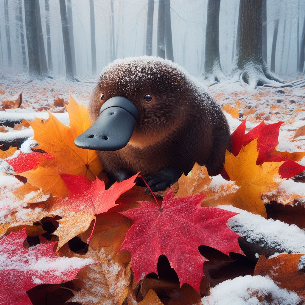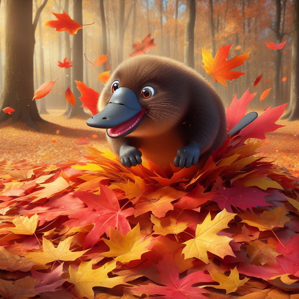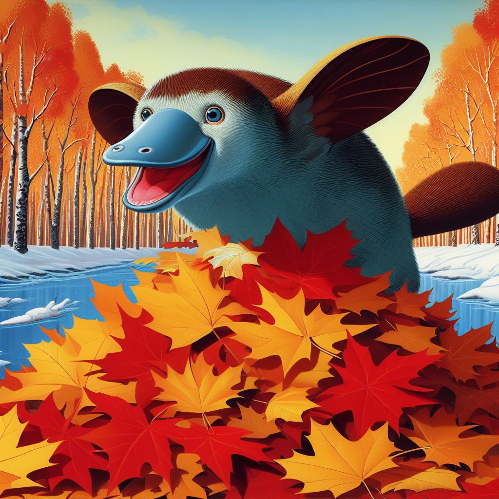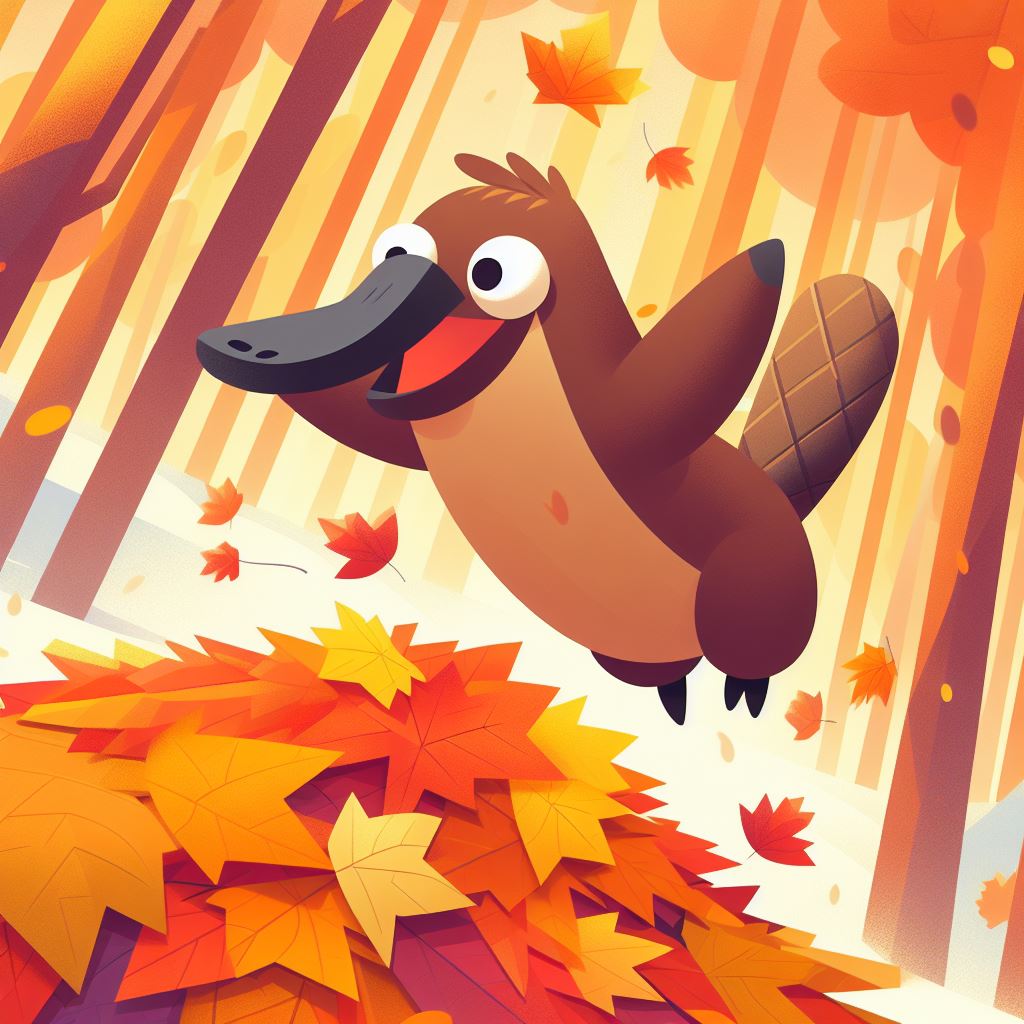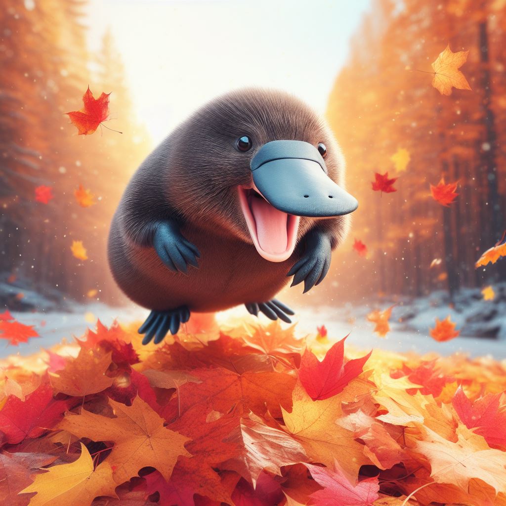 Запрос: «Улыбающийся утконос, прыгающий в кучу осенних золотистых и красных листьев на фоне зимнего леса в стиле экшн-фотографии».