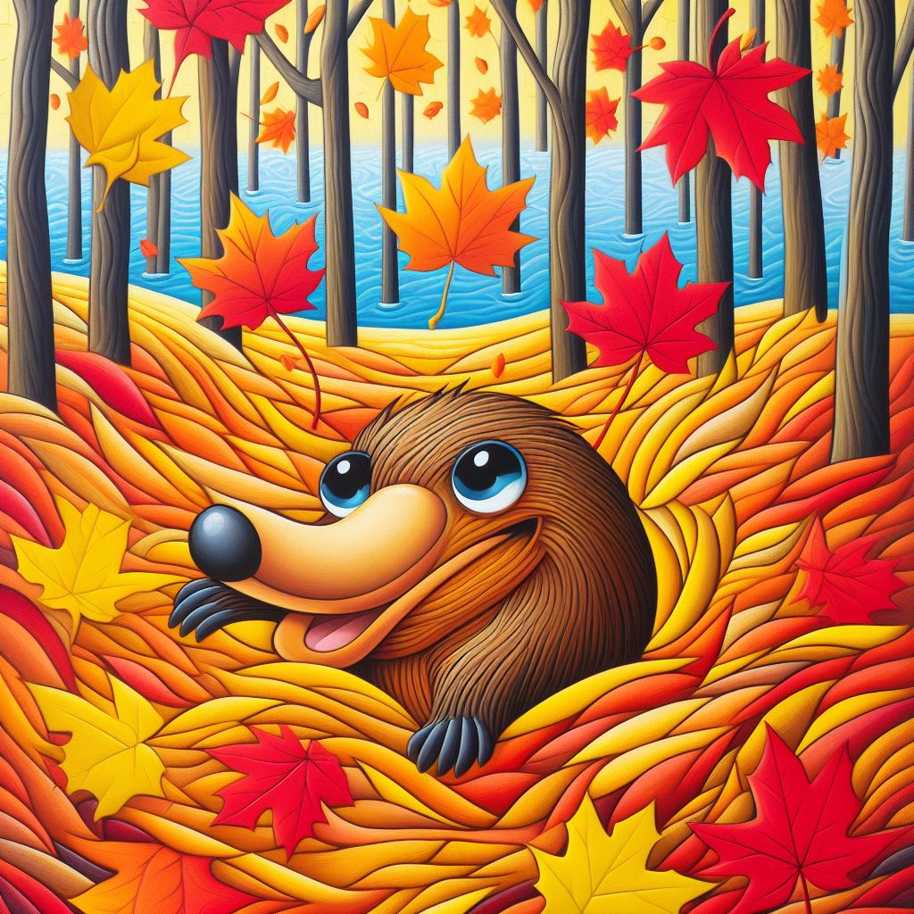 Запрос: «Улыбающийся утконос, прыгающий в кучу осенних золотистых и красных листьев на фоне зимнего леса в стиле социалистического реализма».
