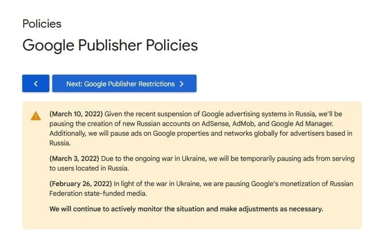 Первые неполадки в работе Google Рекламы начались 28 февраля, когда пользователи не могли попасть на сайт рекламодателя по клику на объявление. 3 марта был приостановлен показ рекламы пользователям, находящимся в России. 10 марта пропала возможность создавать новые российские аккаунты в AdSense, AdMob и Google Ad Manager, а затем приостановили размещение рекламы по всему миру для рекламодателей из в России.
