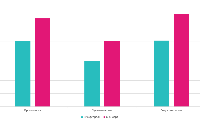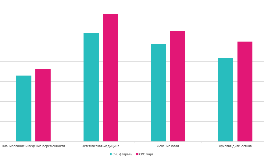 По многопрофильным центрам в целом стоимость клика в марте выросла на 5,7%. Этот показатель разнится в зависимости от направления и услуги.