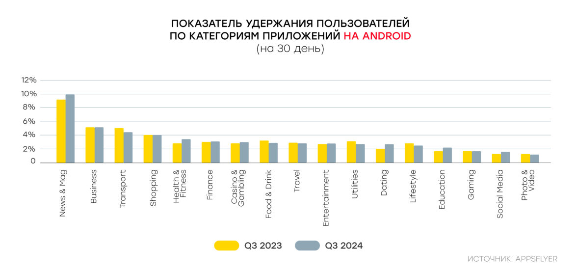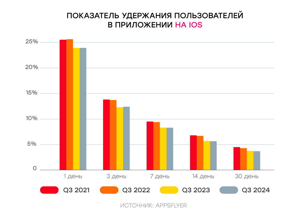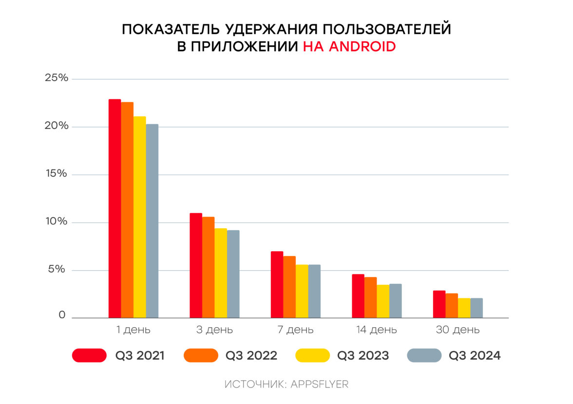 Такой сдвиг может быть связан со снижением показателей удержания. По данным Appsflyer, в период с 2021 по 2024 год Retention Rate на Android и iOS последовательно снижался.