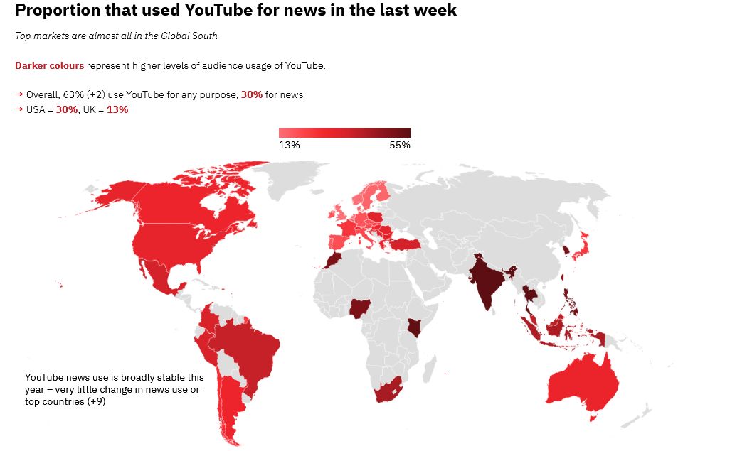 Еженедельное использование YouTube для просмотра любых видео выросло во всем мире за год на 2 п.п. до 63%. Количество пользователей, которые смотрят на YouTube новостной контент осталось на уровне 30%. Эта доля достигает 50% в Индии, Таиланде и Кении. Авторы исследования связывают популярность видеоформата новостей в этих странах с низким уровнем грамотности населения.