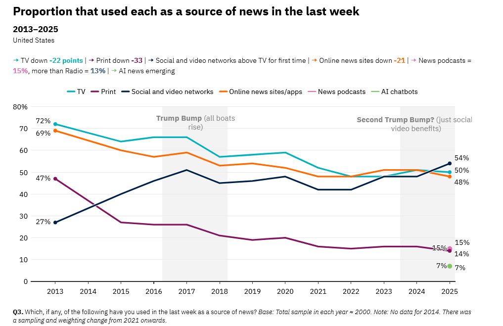 Эти изменения в значительной степени обусловлены потребительскими привычками молодежи, заявляют в RISJ. Более половины (54%) американцев в возрасте до 35 лет и половина в возрасте от 25 до 34 лет утверждают, что соцсети и видеосервисы являются для них основным источником информации (+13 п.п и +6 п.п. к показателям 2024 года).