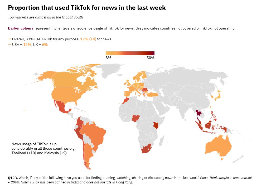 Треть пользователей (33%) из глобальной выборки используют TikTok в принципе, а половина из них (17%) смотрят новости на китайском видеосервисе. TikTok является самым популярным источником новостей в Таиланде с долей 49% (на 10 п.п. больше, чем в прошлом году). В США доля TikTok значительно ниже — 12%, в Европе — 11%.
