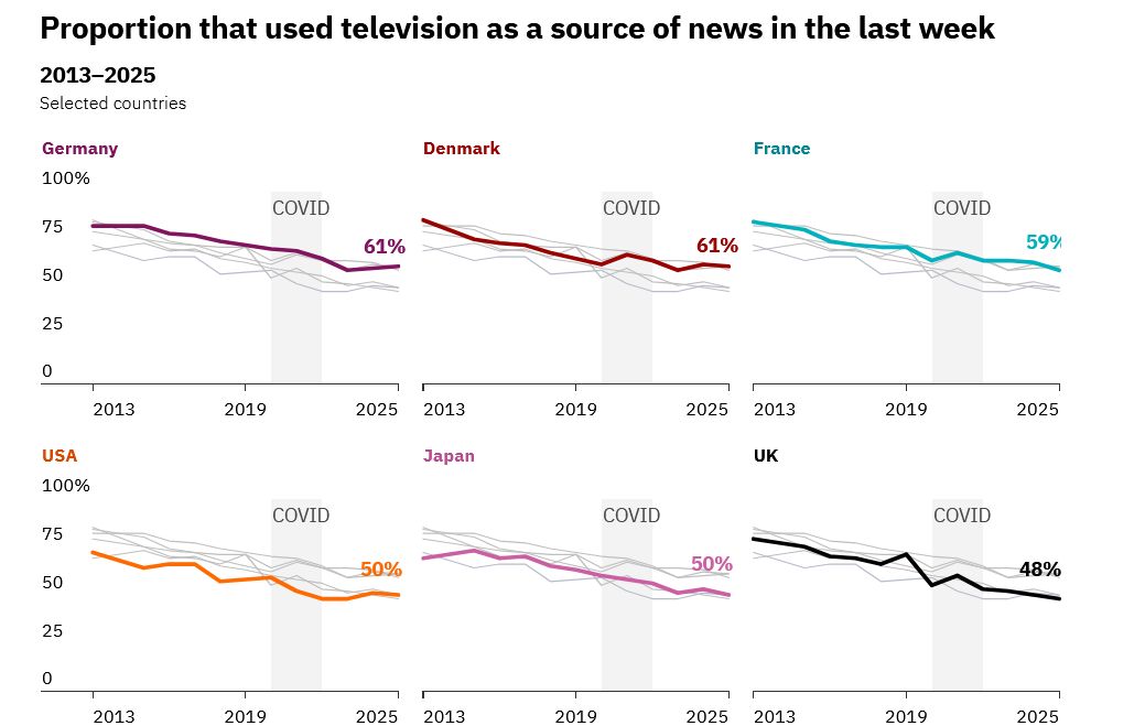 В других странах пропорция тех, кто в первую очередь читает новости в соцсетях и смотрит на видеосервисах, ниже. В Бразилии — 35%, в Великобритании — 20%, во Франции — 19%, но эта доля растет. В противовес продолжает сокращаться охват телевизионных новостей. В 2025 году доля тех, кто в первую очередь смотрит новости на ТВ, сократилась на 4 п.п. по сравнению с 2024-м во Франции и на 3 п.п. в Японии, до 59% и 50% соответственно.