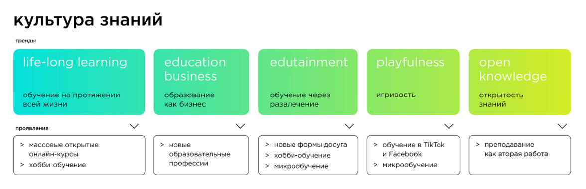 Проявление тренда: хобби-обучение. Статус опыта, который человек получает в сферах жизни, не связанных с обучением или профессией, меняется. Этот опыт все чаще воспринимается не просто как важный, а как более важный: он не только расширяет кругозор, но и развивает когнитивные способности лучше, чем чем традиционное образование в стенах школы и института. Благодаря этому становятся популярными просветительские проекты и культурные платформы.