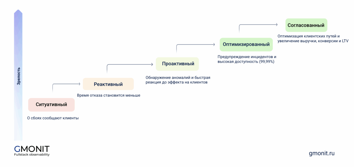 Полностью согласованный с бизнесом. Наблюдаемость служит стратегическим активом, который напрямую влияет на выручку, удовлетворенность клиентов и репутацию. ИТ-команда и топ-менеджмент работают как единый механизм.