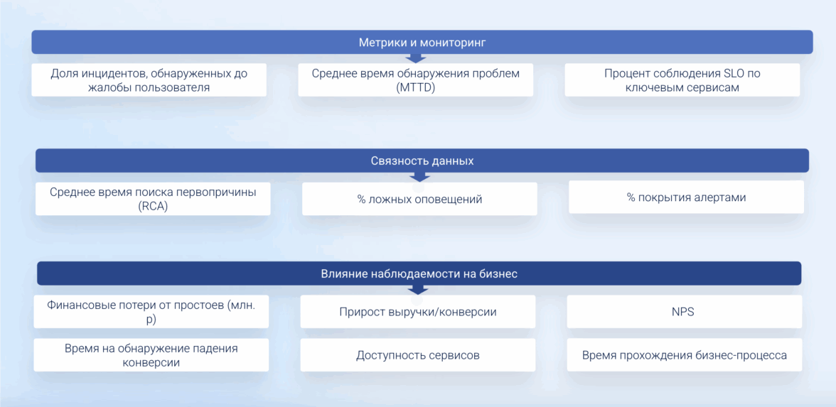 Радар — это не просто инструмент диагностики, а полноценная дорожная карта развития наблюдаемости. Анализ охватывает не только технические аспекты, но и управленческие процессы, помогая бизнесу выстраивать системный подход к развитию ИТ и операционных практик.