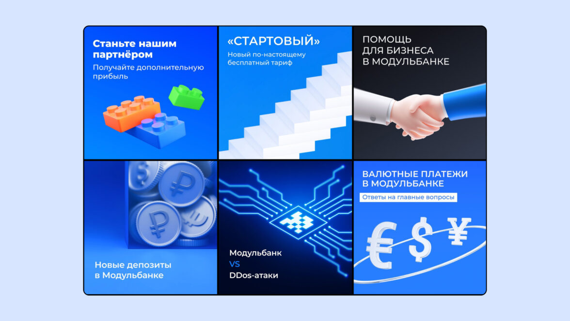 До февраля 2024-го инстаграм* «Модульбанка» выкладывал контент по канонам b2b-маркетинга: рассказывал о продуктах, пользе — всё это в фирменных цветах, со стоковыми фотками или простой графикой.