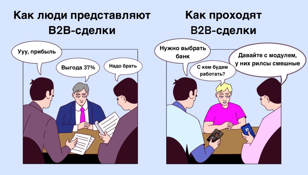 Мем не о том, что в b2b всегда легко и смешно, — он о том, что в b2b работают люди и продавать нужно людям. Не впадайте в крайности со стереотипами, что в b2b серьёзные дядьки, которые не умеют улыбаться. Бывают по-разному — изучайте аудиторию и выбирайте подходящий для неё контент.