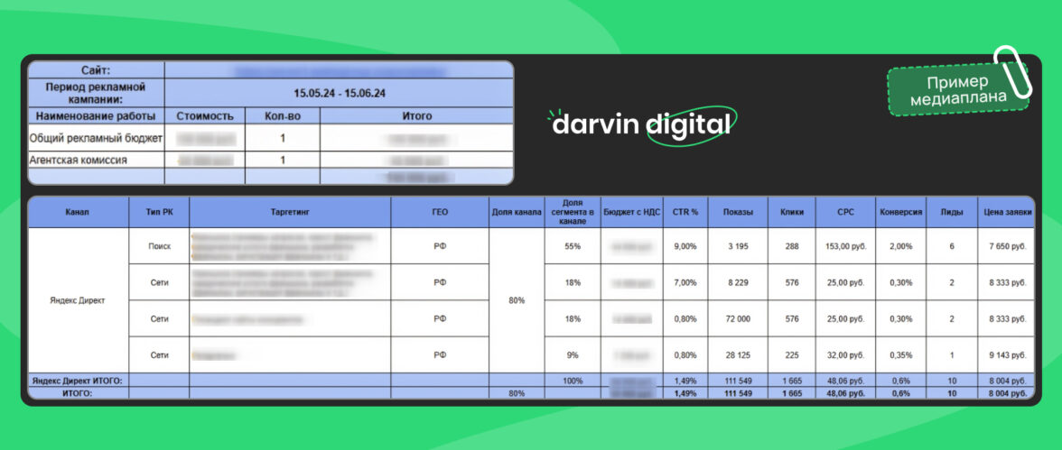Например, в рекламе Яндекса есть порог вхождения по бюджету для эффективности рекламы. Он позволяет поддерживать определённый поток конверсий в неделю для полноценной работы кампаний. Вот так выглядит расчёт окупаемости и пример медиаплана Darvin Digital: