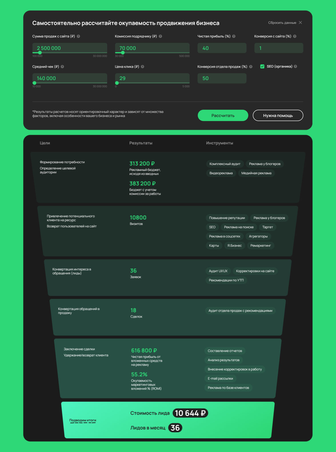 Также эти расчёты помогут сформулировать задачу для подрядчика, поставить измеряемую цель и запланировать бюджет на рекламу. Предприниматель знает, сколько нужно выделить денег на определенное количество заявок и сколько принесут полученные клиенты в деньгах. Цифры должны быть не просто желаемыми, а реалистичными. Если не можете рассчитать рекламный бюджет самостоятельно, приходите к нам на консультацию. Мы умеем работать с многомиллионными бюджетами и находим оптимальные решения под небольшие.