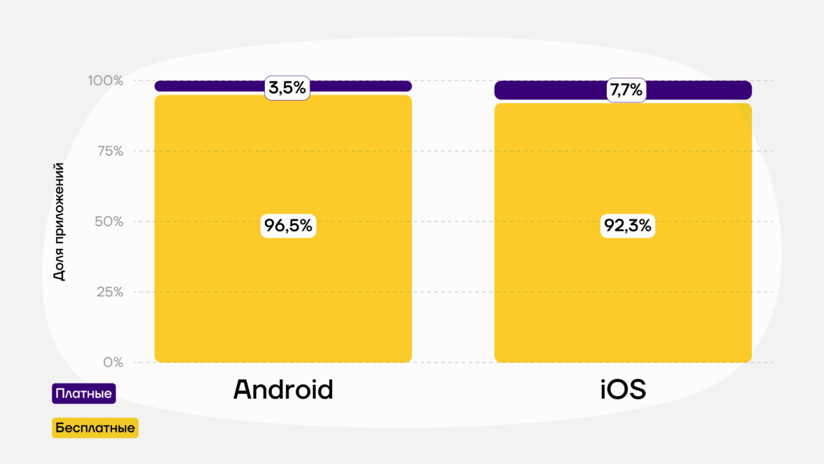 Сходу скажем, что это не самый популярный вариант. Только 3,5% приложений в Google Play и 7,7% App Store по умолчанию платные.