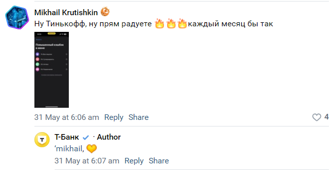 Здесь T-Банк на похвалу от пользователя лаконично отвечает сердечком