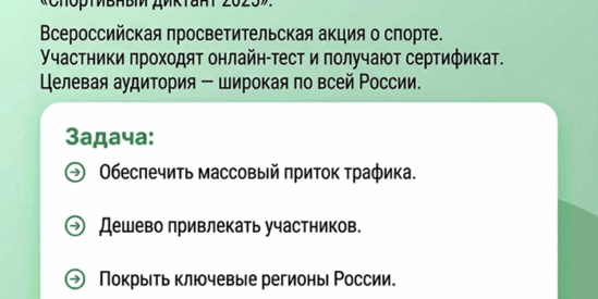 Олимпийский комитет России обратился к нам с задачей продвижения всероссийской просветительской акции «Спортивный диктант 2025» — быстро собрать участников по всей России и раскачать новый сайт проекта. За два месяца мы запустили комплексную рекламу в Яндекс.Директ, VK, Telegram и через посевы, привели более 23 000 переходов на сайт и отработали рекламный бюджет 555 000 руб.