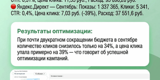 При почти двукратном сокращении бюджета в сентябре количество кликов снизилось только на 34%, а цена клика упала примерно на 39% — что говорит об успешной оптимизации кампаний.