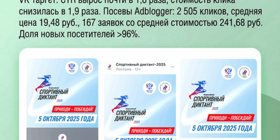 Организовали посевы в спортивных и новостных сообществах VK через Adblogger: тематики «спорт и ЗОЖ», «здоровье», «новости и СМИ», география — те же 16 городов РФ. Этот канал дал стабильный поток заявок с очень низкой стоимостью клика и разумной стоимостью лида.