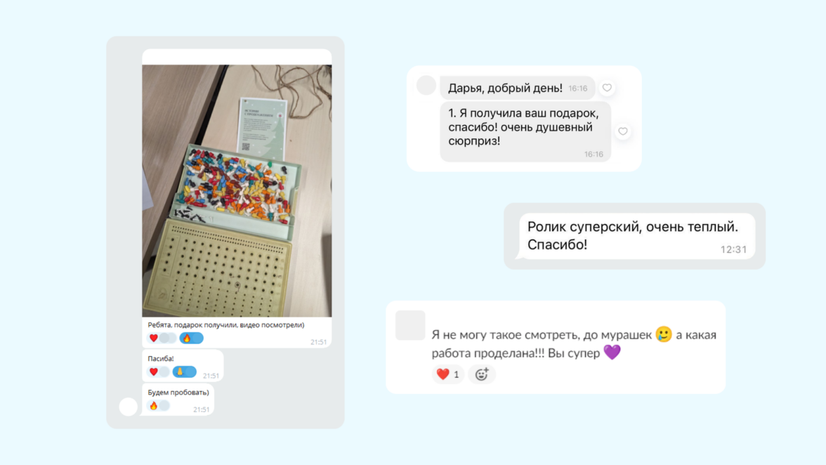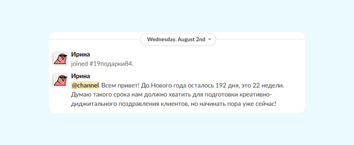 Пример прошлого года: осенью мы пожали друг другу руки, что мы ничего не изобретаем, а дарим шампанского и мандарины. Потому что лучший подарок за стоимость хорошего шампанского — это шампанское. Но в декабре все равно не удержались — и вот мы заказываем орехи, делаем чат-бот и всё это за 2 недели. Было красиво.