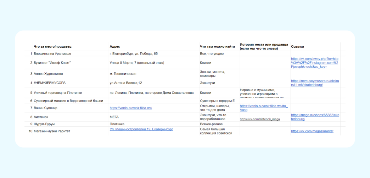 Мы обсудили, какой подарок подойдет каждому клиенту и где их можно поискать. Одни места в самом центре города: например, маленький букинистический «Йозеф Кнехт» и уютная барахолка «Шурум-Бурум». Другие — на Уралмаше, самом известном районе Екатеринбурга. Каждое воскресенье здесь образуется большущий блошиный рынок, а еще работает «Раритет» — магазин с огромными развалами винтажных вещей.