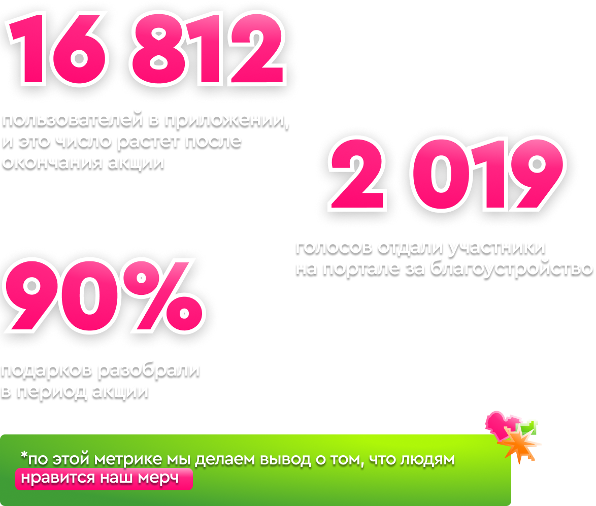 90% призов разобрали за время акции. Мерч стал узнаваемым — участников в фирменных футболках и худи замечали даже в других городах. Это сработало не только как награда за участие, но и как способ распространения проекта.