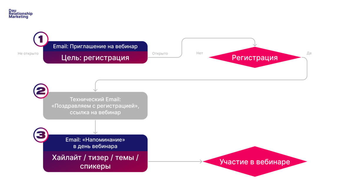 повышение эффективности цепочки анонсирования и прогрева от регистрации участника до непосредственного участия в вебинаре;