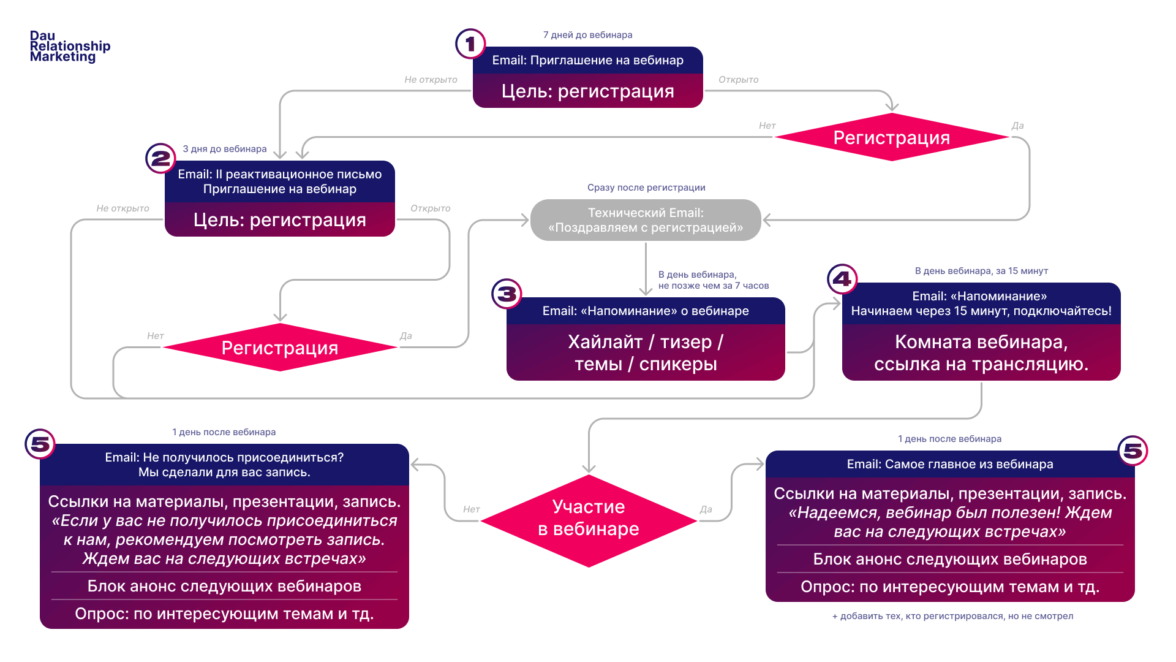 Мы предложили поменять структуру цепочки и использовать следующую схему. Самой важной целью стало поддержание контакта с пользователем от первого приглашения до старта вебинара:
