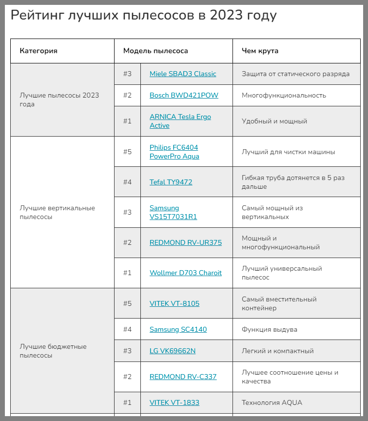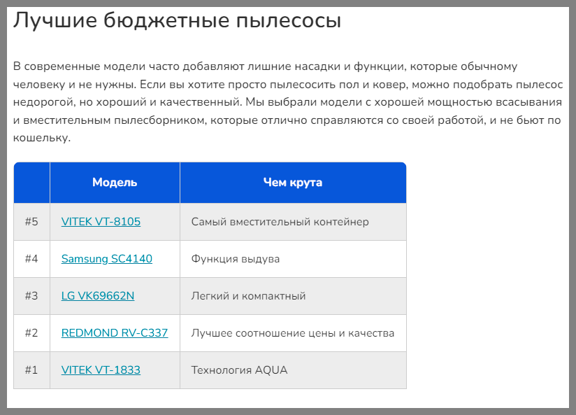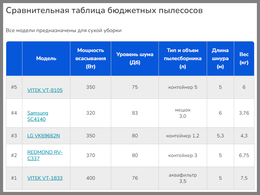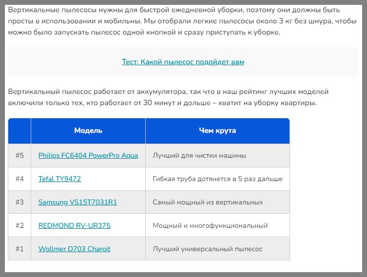 Добавили удобные таблички с характеристиками в начале статьи, со всеми моделями и ссылками на них, и заодно кратко пояснили, чем хорош каждый пылесос. Такие же добавили в начало каждой подборки, чтобы читателю было легче ориентироваться. А в конце каждого раздела расписали таблички с характеристиками моделей из подборки. Чтобы все эти цифры что-то значили для читателя, предварительно в начале статьи объяснили как в них разобраться.