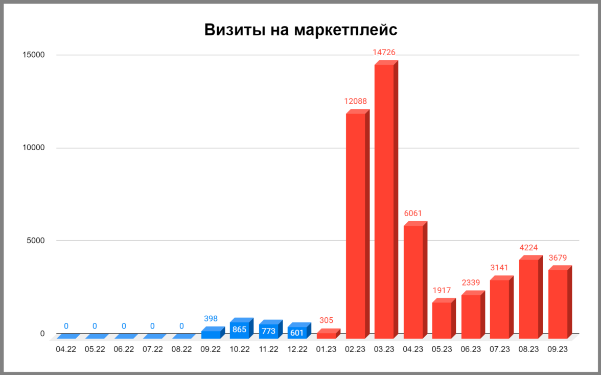 Куда сильнее скакнули переходы из статьи на маркетплейс: с 300 до 6000 переходов в месяц. Это значит, что статья даёт читателям ответы на те вопросы, с которыми они пришли.