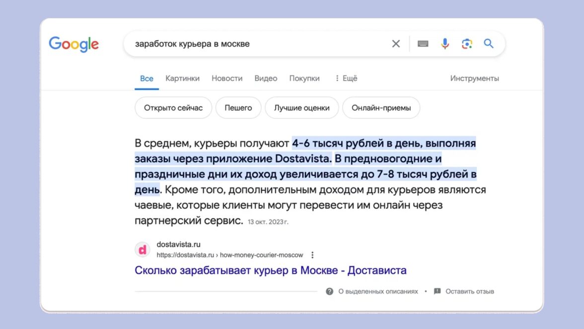 К моменту сотрудничества на сайте Dostavista уже имелся блог, где были статьи для курьеров. Для продвижения под ЦА упускать такую возможность нельзя, и мы занялись подбором запросов, текстовым дополнением и базовой оптимизацией этих материалов. Отдельное внимание мы уделили тем статьям, где по запросам Google показывал featured snippet. Старания не прошли даром: