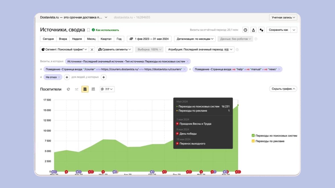 Если взять общий курьерский сегмент, объединив столичный и региональный трафик, то мы смогли привести в раздел сайта 16 000 посетителей в месяц. И эта цифра продолжает расти, что не может не радовать: