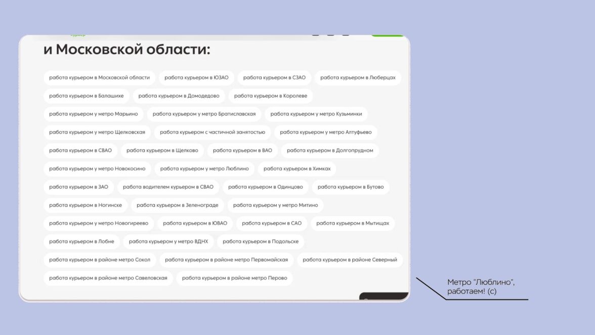 В Москве оказалось множество геозависимых запросов, привязанных к конкретным районам города или даже к станциям метро. Это логично: профессию курьера воспринимают как подработку, а люди стремятся найти второй доход около дома. Да и вообще трудиться недалеко от себя — выгодно, с точки зрения издержек на дорогу. Итак, мы принялись создавать страницы и получили вот такую районную структуру раздела:
