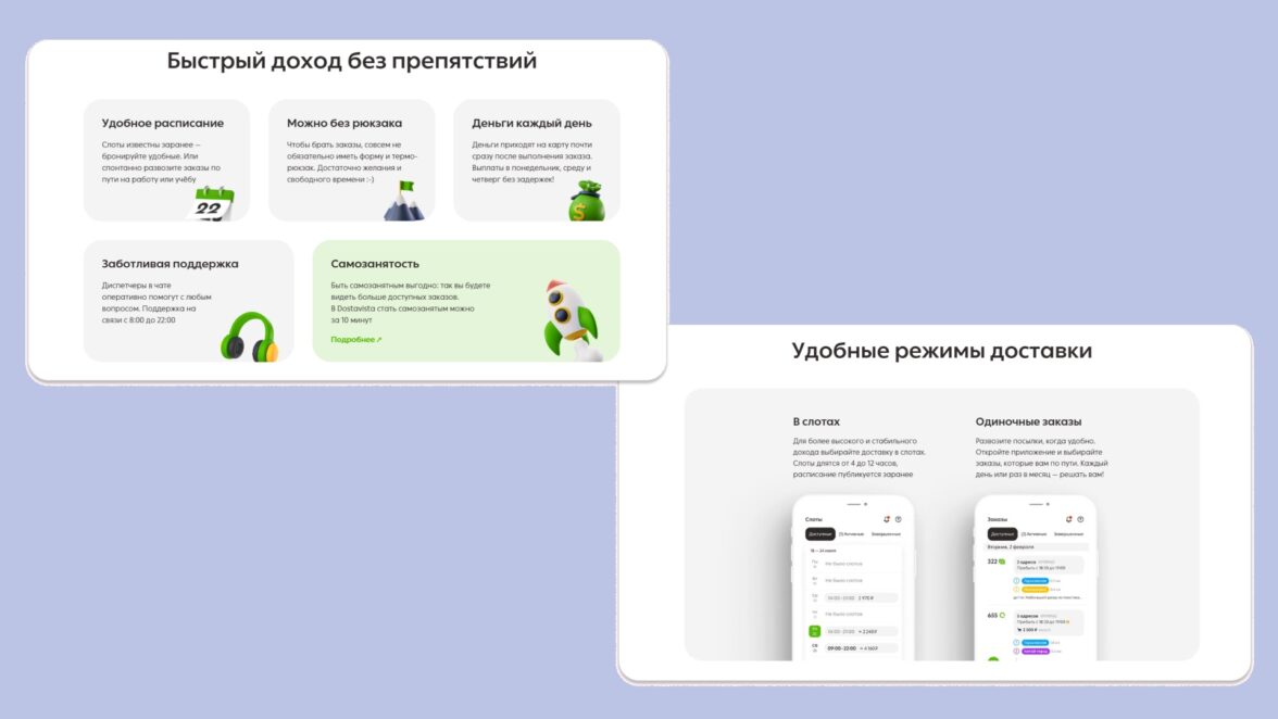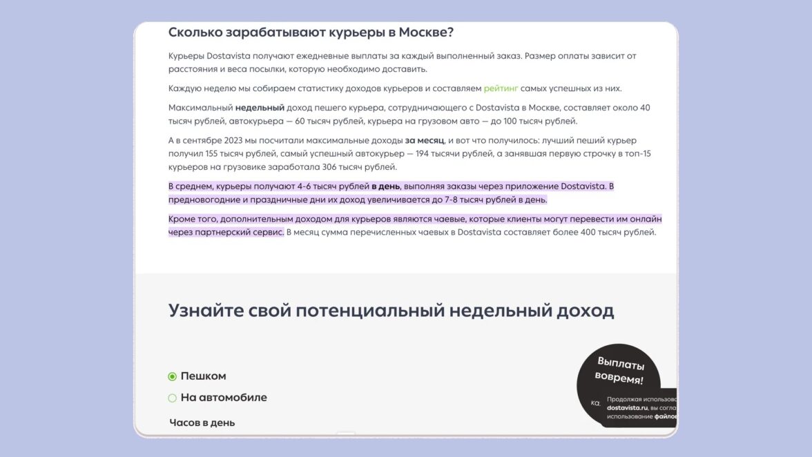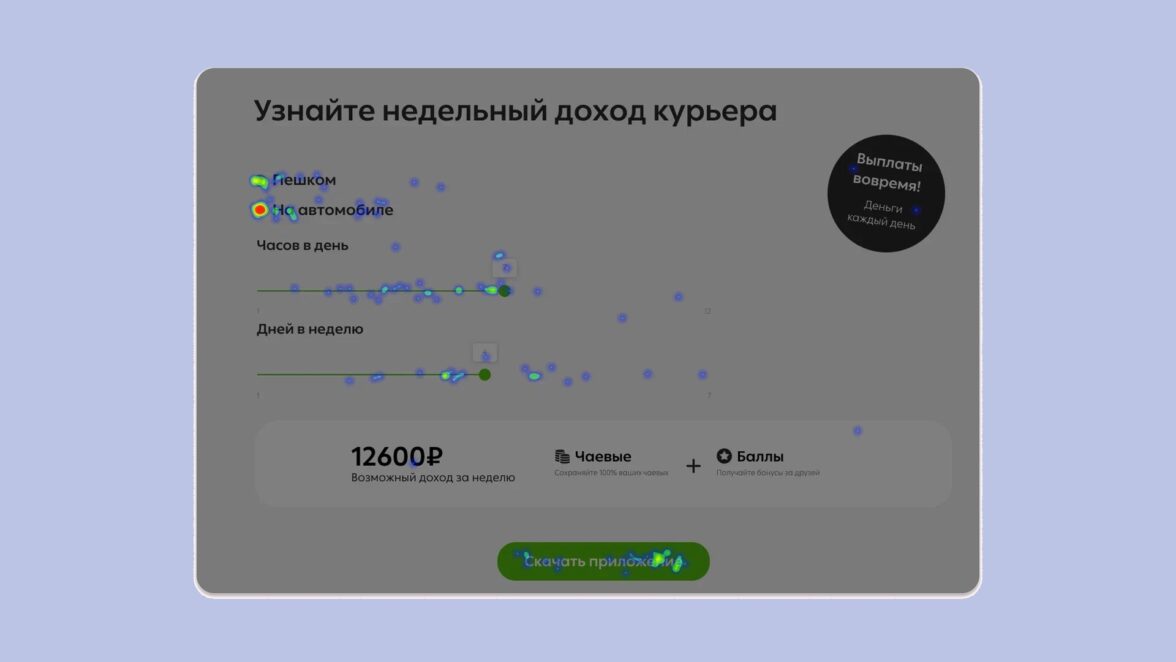 На момент сотрудничества на странице уже был блок с примерным уровнем курьерского заработка. Мы решили пойти дальше, чтобы пользователи понимали: их ждут не два стакана зерна в месяц как в ещё одном меме, но уже с попугаем. Калькулятор в итоге увеличил конверсию и оказался, согласно данным «Метрики», самым кликабельным блоком в новом шаблоне. Он действительно приносит удобство: посетитель страницы сразу может представить уровень будущего заработка при различных графиках.