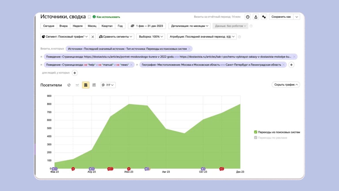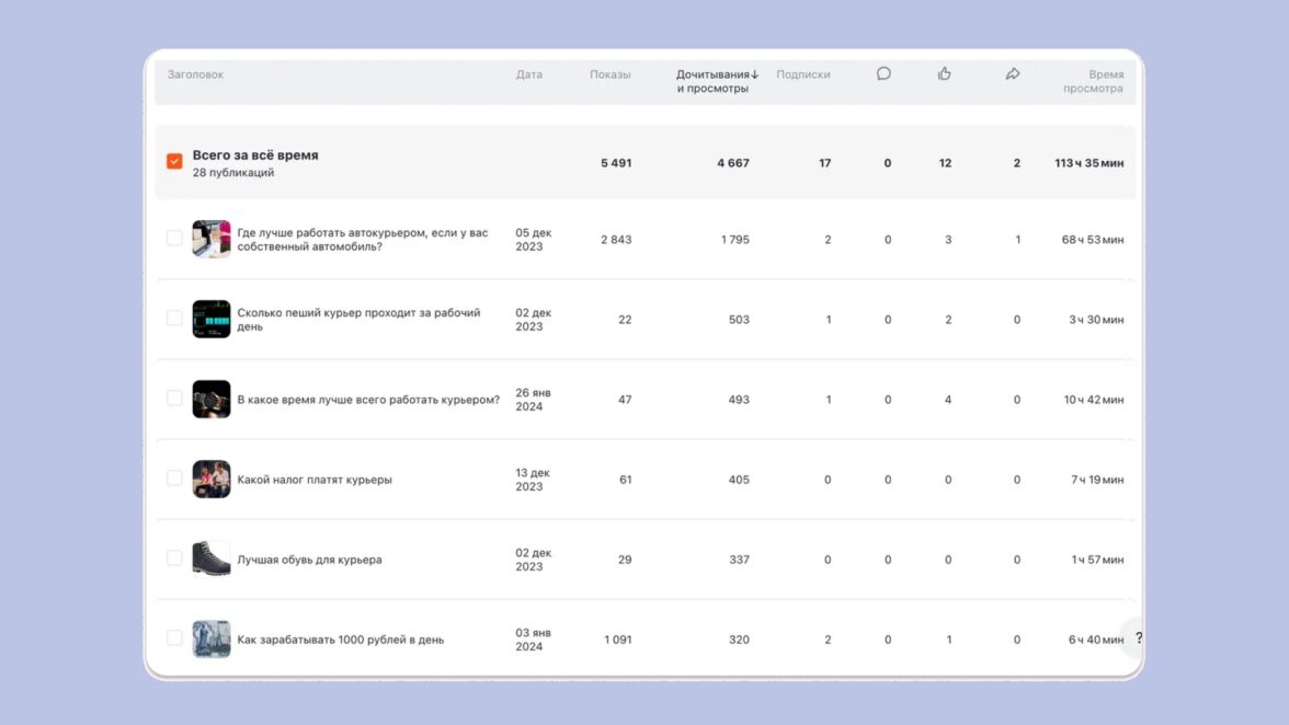 В тексты всех материалов мы также вставляли ссылки на App Store или Google Play для загрузки курьерского приложения Dostavista. К сожалению, переходы в магазин плохо конвертировались в установки и мы приостановили эксперимент по наполнению канала уже в феврале 2024-ого. За три месяца мы успели выпустить 28 статей и, как видно выше, они всё еще приносят трафик в «Дзене». Возможно, мы вернемся к этой площадке, поскольку в повышении узнаваемости бренда она в любом случае эффективна. Ну, а пока что мы сосредоточились на других важных задачах.