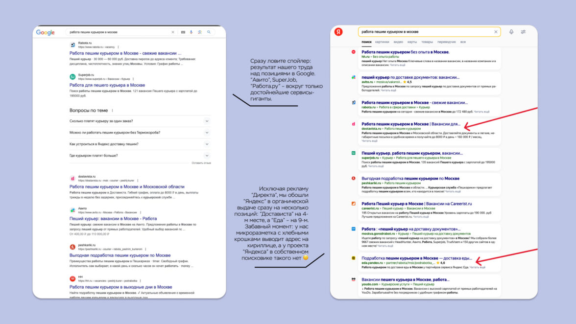 Что касается отечественного поисковика, то нам еще было интересно «потолкаться» в выдаче с сервисами самого же «Яндекса»: курьеры в проектах «Лавка» и «Еда» тоже нужны. Никакие палки в колеса нам в итоге не ставили, и чужие конспирологические теории о подкручивании результатов не подтвердились: мы спокойно конкурируем с сервисами «Яндекса» в выдаче и даже опережаем их по отдельным запросам.