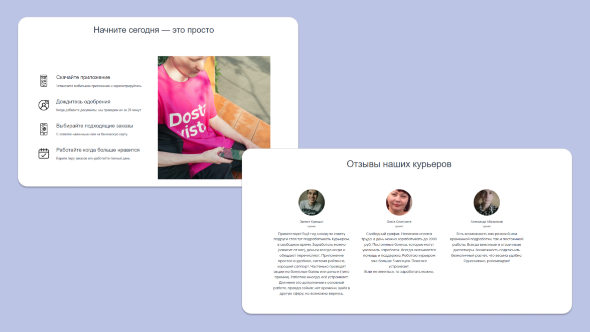 Проанализировав выдачу, мы приступили к первым активным действиям. Сначала решили пошаманить над шаблоном курьерской страницы. На старте проекта страница уже была достаточно информативной: ее можно посмотреть в веб-архиве. Ребята еще до нас расписали преимущества сервиса и условия, а также добавили отзывы: