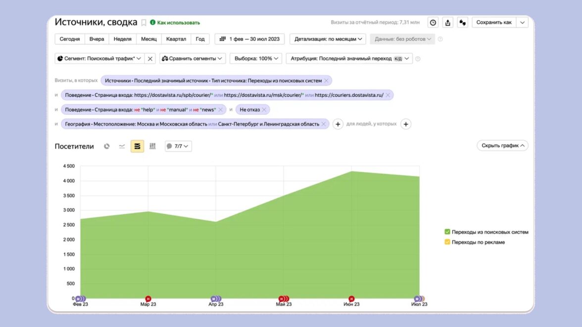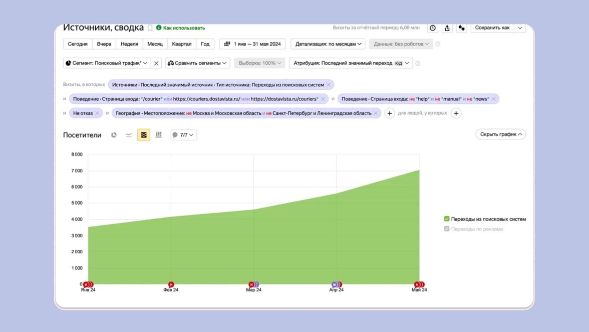 Dostavista пришла к нам в феврале 2023-ого года с не самой очевидной задачей. Команду интересовало внимание конкретной целевой аудитории: наша цель заключалась в том, чтобы привести целевой трафик в раздел для курьеров. До этого компания не работала с SEO-оптимизацией и была сосредоточена на продвижении мобильного приложения для курьеров. Однако трафик на сайте всё равно постепенно рос. Так что мы с радостью занялись масштабированием этих первых успехов.