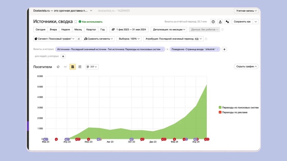Мы обнаружили совершенно бомбическую группу запросов «работа курьером для школьников». По условиям Dostavista, регистрироваться в сервисе можно уже с 14 лет, так что курьеры-старшеклассники вполне попадали под нашу целевую аудиторию. Наша команда создала отдельную страницу, и уже к лету 2023-ого она стала приносить 1 000 дополнительных посетителей ежемесячно. К слову, чуть меньше, чем через год, страница начала приносить уже более 5 000 человек в месяц. Ну и кто после этого скажет, что современная молодежь инфантильная или безответственная?