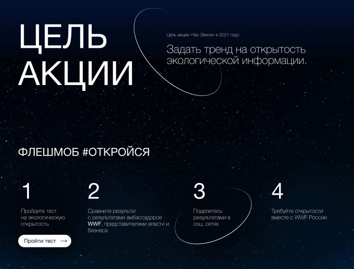В рамках этой миссии в 2021 году проходил флешмоб #откройся: все желающие могли пройти тест на экологическую открытость, сравнить свой результат с амбассадорами WWF, представителями власти и бизнеса, и поделиться итогами в соцсетях.Слоганом акции стал призыв: «Требуйте открытости вместе с WWF России». Сильное и запоминающееся заявление.