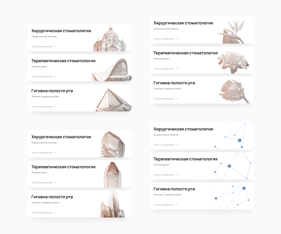 Попробовали применить к услугам образы созвездий. Отрисовали их в разных видах. Лучше всего созвездия смотрелись на чёрном фоне, но это повлияло бы на общую светлую концепцию сайта, которая не предполагала тёмных бэкграундов. Искали образы в архитектуре, но когда подобрали несколько вариантов — поняли, что они несут дополнительную нагрузку для восприятия, а не облегчают подачу материала. Смотрели экзотические растения с интересными силуэтами: мягкие формы цветов для терапии и острые для хирургии. Но и это решение осталось на уровне идеи.