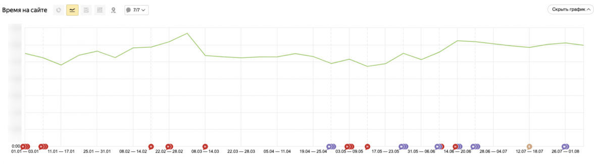 3. Время на сайте. Есть повышенный срок и на старой кодовой базе (февраль-март в период сезона подарков), но в остальных периодах в среднем на минуту больше пользователи стали находиться на сайте.