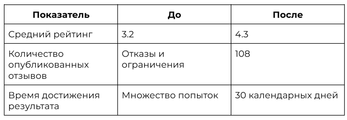 1. За месяц нам удалось поднять рейтинг клиента с 3.5 до 4.3 на ведущей площадке отзывов в России, что значительно улучшило его позицию и доверие пользователей.