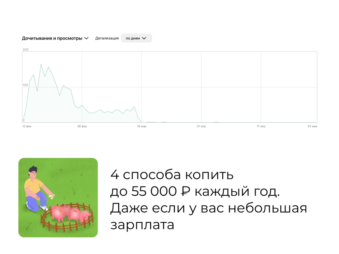 И тут алгоритмы взорвались: за первые несколько дней мы получили почти 15 000 дочитываний и почти 150 000 тысяч показов в пользовательской ленте. Гипотеза была подтверждена: Дзен работает, просто темы для него нужно подбирать отдельно и очень тонко.