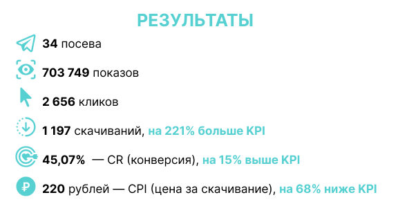 Статичный креатив принес нам намного больше скачиваний, чем пост с видео. Поэтому мы продолжили размещение уже только с первым постом.