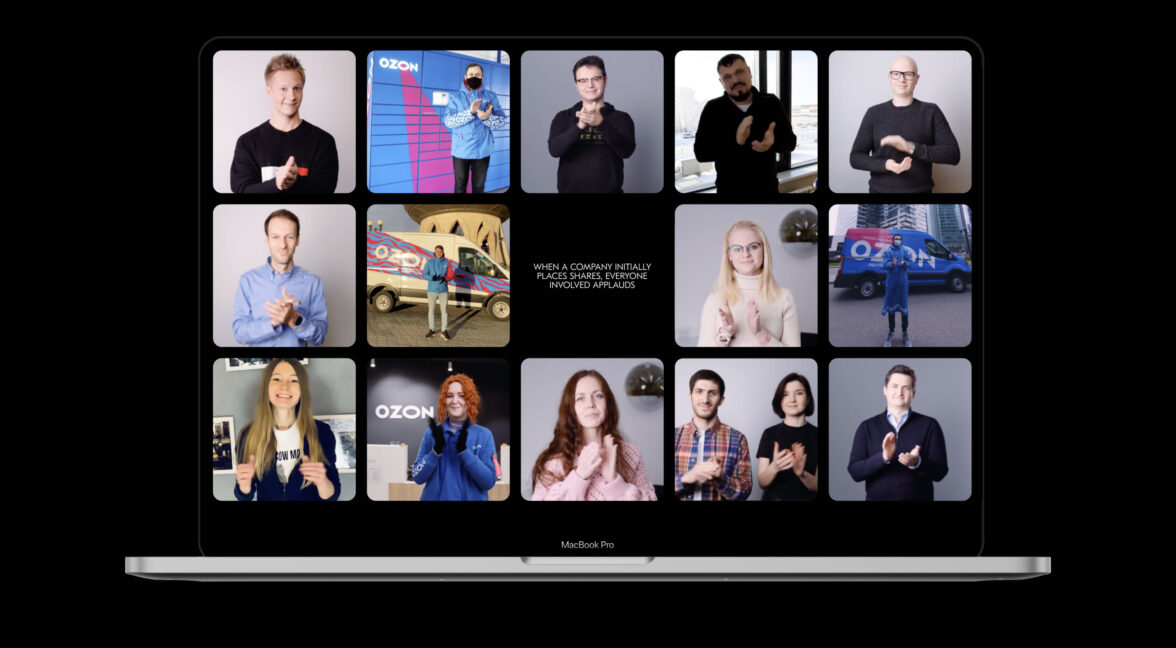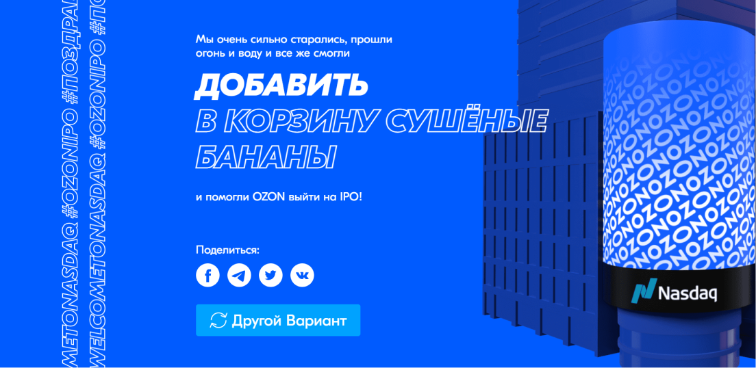 Ozon обратились к нам после кейса для Билайн.Аналитика про COVID. Задачей было осветить выход Ozon на IPO и поблагодарить основателей, партнеров, сотрудников и клиентов за их вклад и поддержку. СЕО Spans Agency Илья Ерастов очень заинтересовался этим сложным, но воодушевляющим запросом, и мы приступили к работе. Сразу скажем — сроки горели очень сильно.Работали по нашей классической схеме: сначала предложили несколько различных концепций — вирусную, серьезную, веселую и тд. Заказчик выбрал наиболее подходящий их видению, и мы передали концепты нашим дизайнерам.Идея была в том, что в 2020 году из-за COVID все перешло в онлайн. Поэтому на первую страницу мы поместили логотип Ozon на фасаде биржи в Нью-Йорке и ссылку на онлайн трансляцию церемонии запуска торгов.