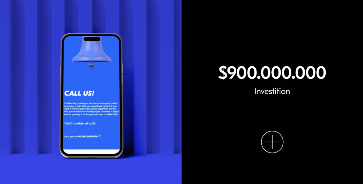 Первое, конечно же, начало торгов всегда начинается со звонка в колокол на бирже. Мы обыграли это с помощью интерактивного дизайна: на сайте разместили колокол и счетчик звонков, призывающий всех посетителей сайта позвонить в него.