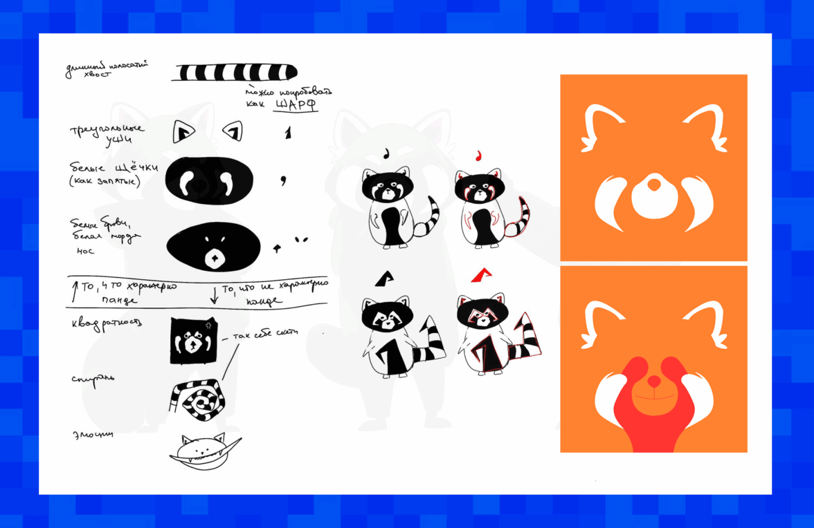Потом — выбор. Вместе с клиентом утвердили красную панду и начали развивать её характер.
