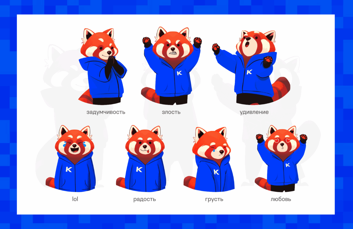 Затем — библиотека. Нарисовали десятки поз и эмоций: с ноутбуком, в шапке Деда Мороза, на встрече. Маскот стал подходящим для любого повода.